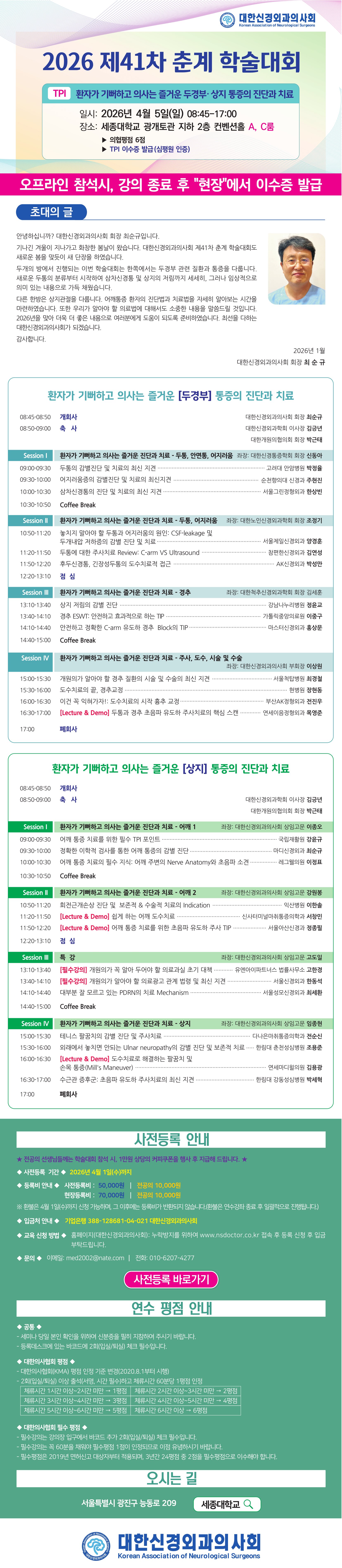 오프라인 교육만 진행합니다. (온라인 X) 학술대회 당일 참석해 주신 모든분들께 강의 종료 후 [TPI 이수증]을 현장에서 드립니다. 2026 제41차 대한신경외과의사회 춘계 학술대회 일시 ▶ 2026년 4월 5일(일) 8:40-17:10 장소 ▶ 세종대학교 광개토관 지하2층 컨벤션홀 평점 ▶ 의협 6점 (필수 1점) 사전 등록비▶ 전문의 5만원 >> 전공의 1만원 현장 등록비▶ 전문의 7만원 >> 전공의 1만원 전공의 선생님들께는 학술대회 등록후 출석시, 1만원 스벅쿠폰을 돌려드립니다. (노쇼 방지를 위한 조치임을 너른 양해 부탁드립니다.) ☆ 사전등록 바로가기 >> TPI- 두경부 (사전등록비 5만원 /의협 6점) ☆ 사전등록 바로가기 >> TPI- 상지 (사전등록비 5만원 / 의협 5점 + 필수 1점) ☆ 필수강의 들으시는 선생님들께서는 필수강의 시간 앞,뒤 바코드 출석을 꼭 다시 해주세요. 2개 강의 중 1개 선택해서 등록. * 신경외과가 아닌, 타과 전문의도 접수 가능하시며 TPI 이수증도 동일하게 드립니다.* * 필수평점 원하시는 경우 [상지] 등록해주세요* ♧ 입금처 : 기업 388-128681-04-021 대한신경외과의사회 ♧ 운영사무국 문 의 : 전화 010-6207-4277 / 이메일 med2002@nate.com ![]() |
